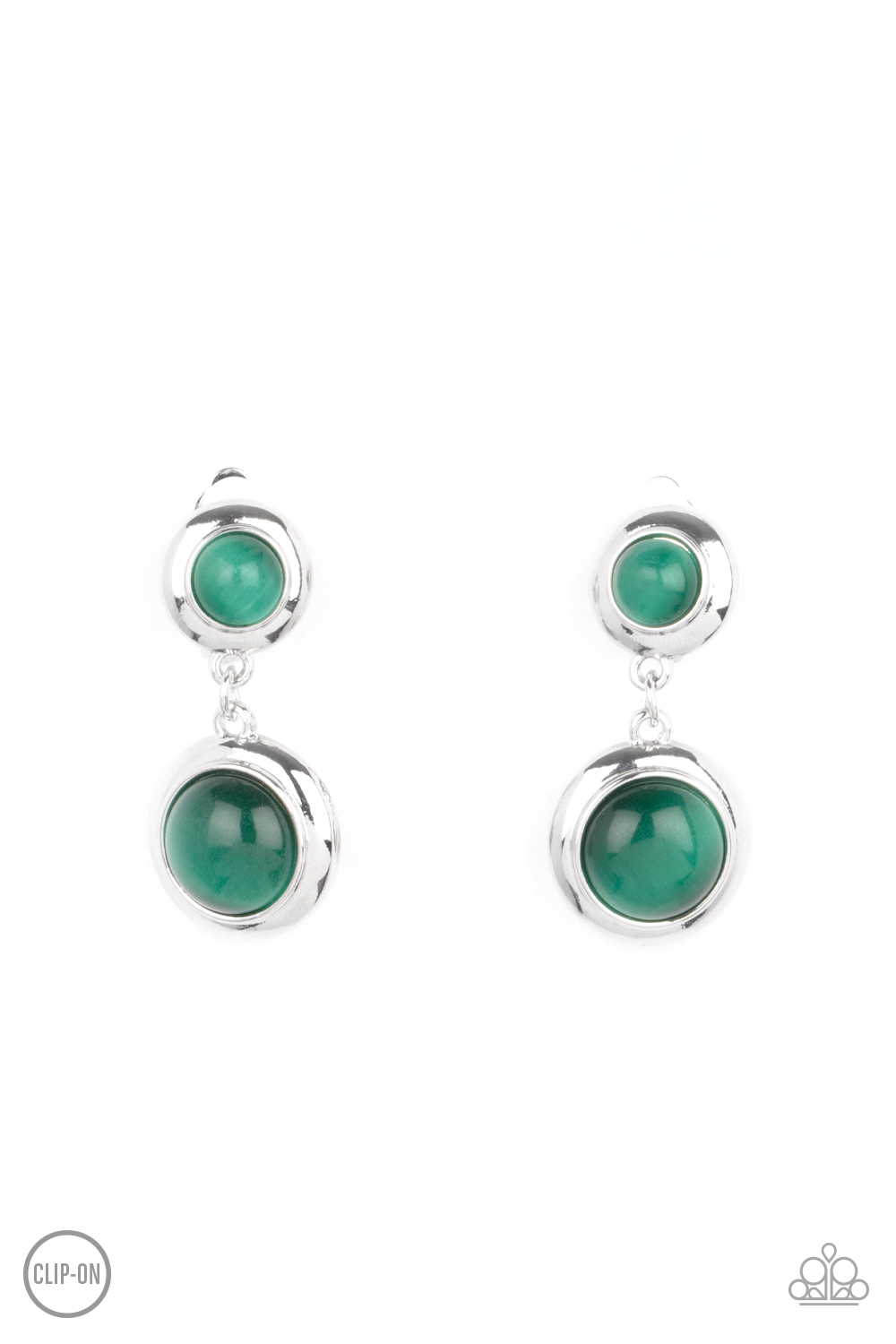 Encased in sleek silver fittings, two green cat's eye stones link into a whimsical lure. Earring attaches to a standard clip-on fitting.