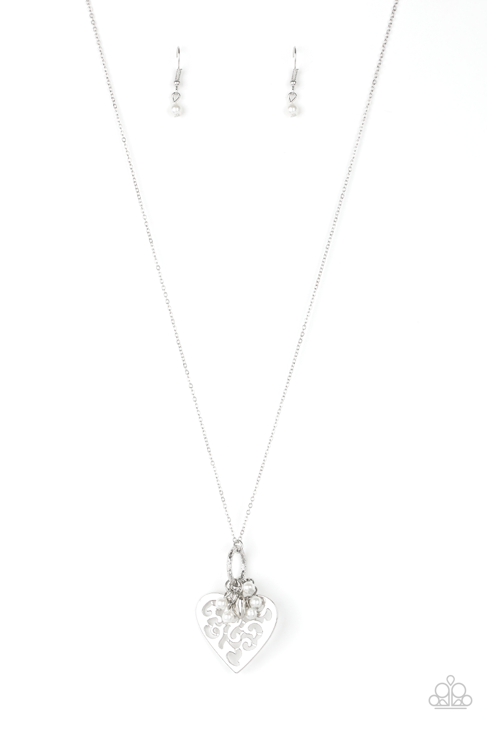 Infused with dainty white pearls and a shimmery silver heart charm, a stenciled silver heart pendant swings from the bottom of a lengthened silver chain for a whimsical look. Features an adjustable clasp closure.