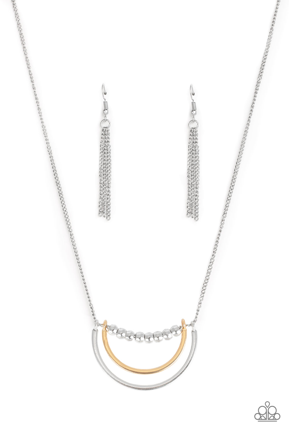 A strand of shiny silver beads give way to bowing gold and silver frames, creating an edgy pendant below the collar. Features an adjustable clasp closure.