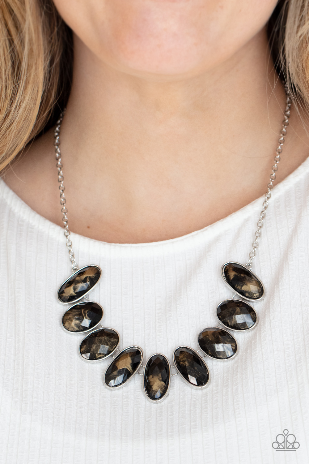 Generous glossy black gems, dusted in shimmery gold, lay in silver oval frames and link across the collar creating a glimmering statement. Features an adjustable clasp closure.