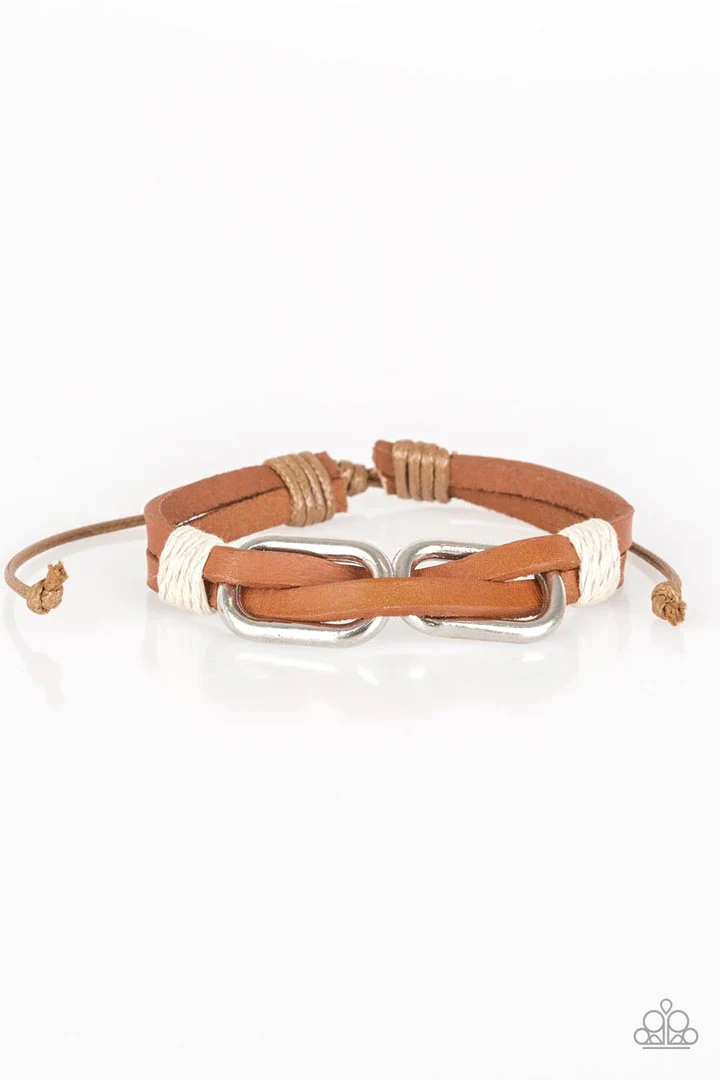 Infused with white cording, strips of brown leather lace through silver links for an adventurous look. Features an adjustable sliding knot closure.