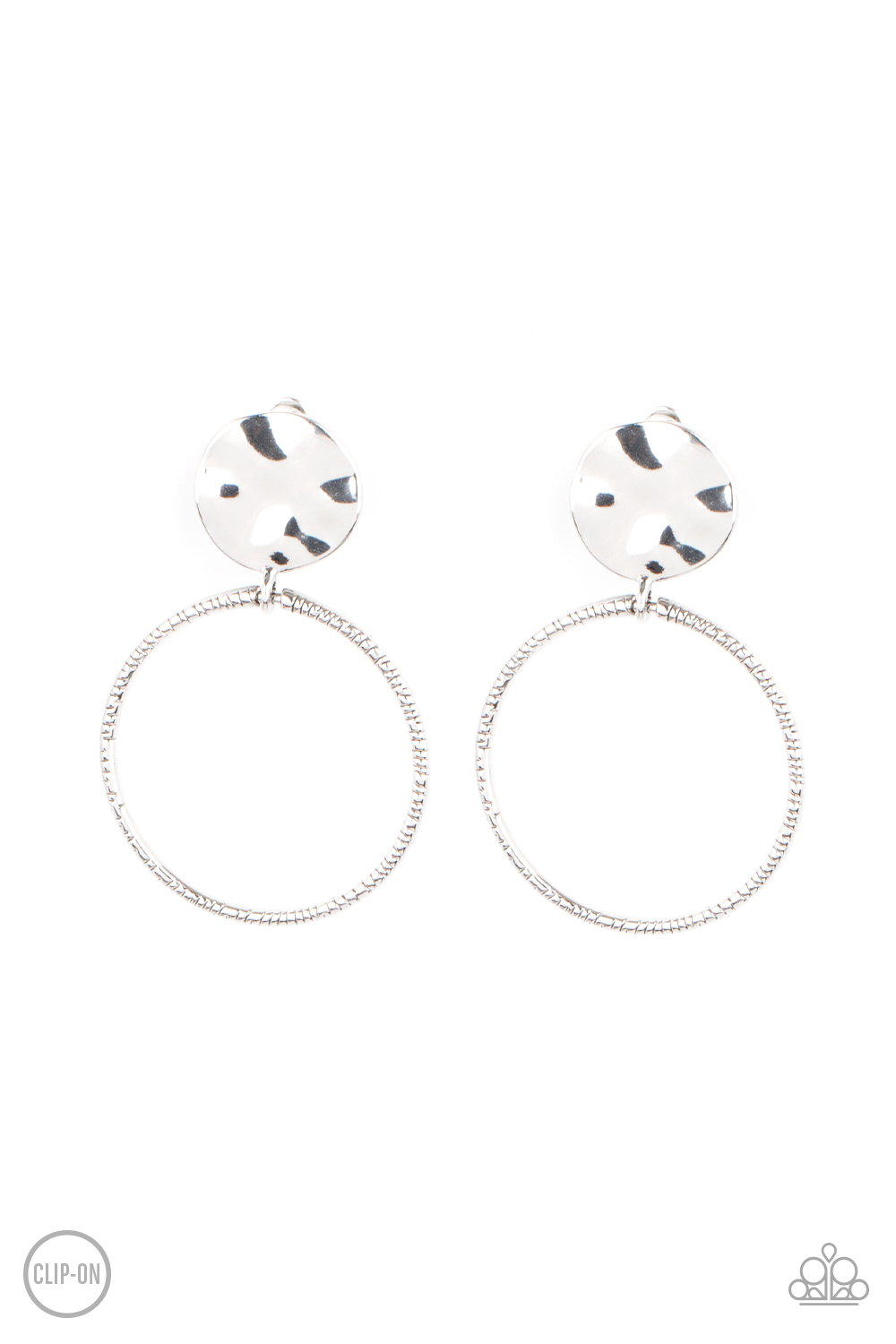 A textured silver hoop attaches to a hammered silver disc, creating an edgy hoop. Earring attaches to a standard clip-on fitting.
