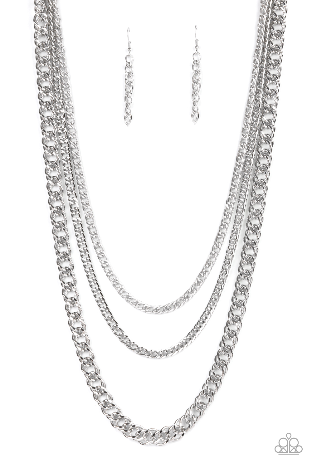 Bold layers of glistening silver chains of varying sizes and textures, fall like a weighty medal across the chest creating an edgy industrial effect. Features an adjustable clasp closure.