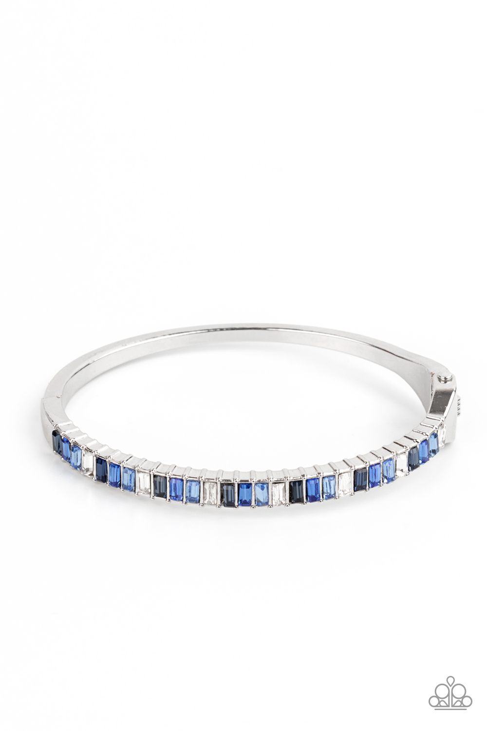 Featuring regal emerald style cuts, a dainty row of blue and white rhinestones are encrusted across the front of a silver cuff-like bangle for a timeless fashion. Features a hinged closure.