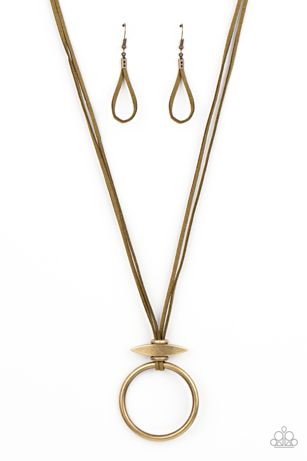 Flanked by dainty brass rings, a marquise-shaped brass bead glides along lengthened strands of earthy green suede, holding in place an oversized brass ring at the bottom for an artisan-inspired fashion. Features an adjustable clasp closure.