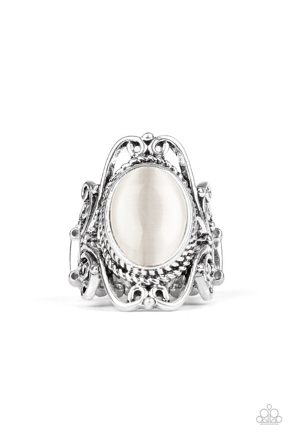A glowing white cat's eye stone is nestled inside of an airy silver frame radiating with frilly filigree for a whimsical look atop the finger. Features a stretchy band for a flexible fit.