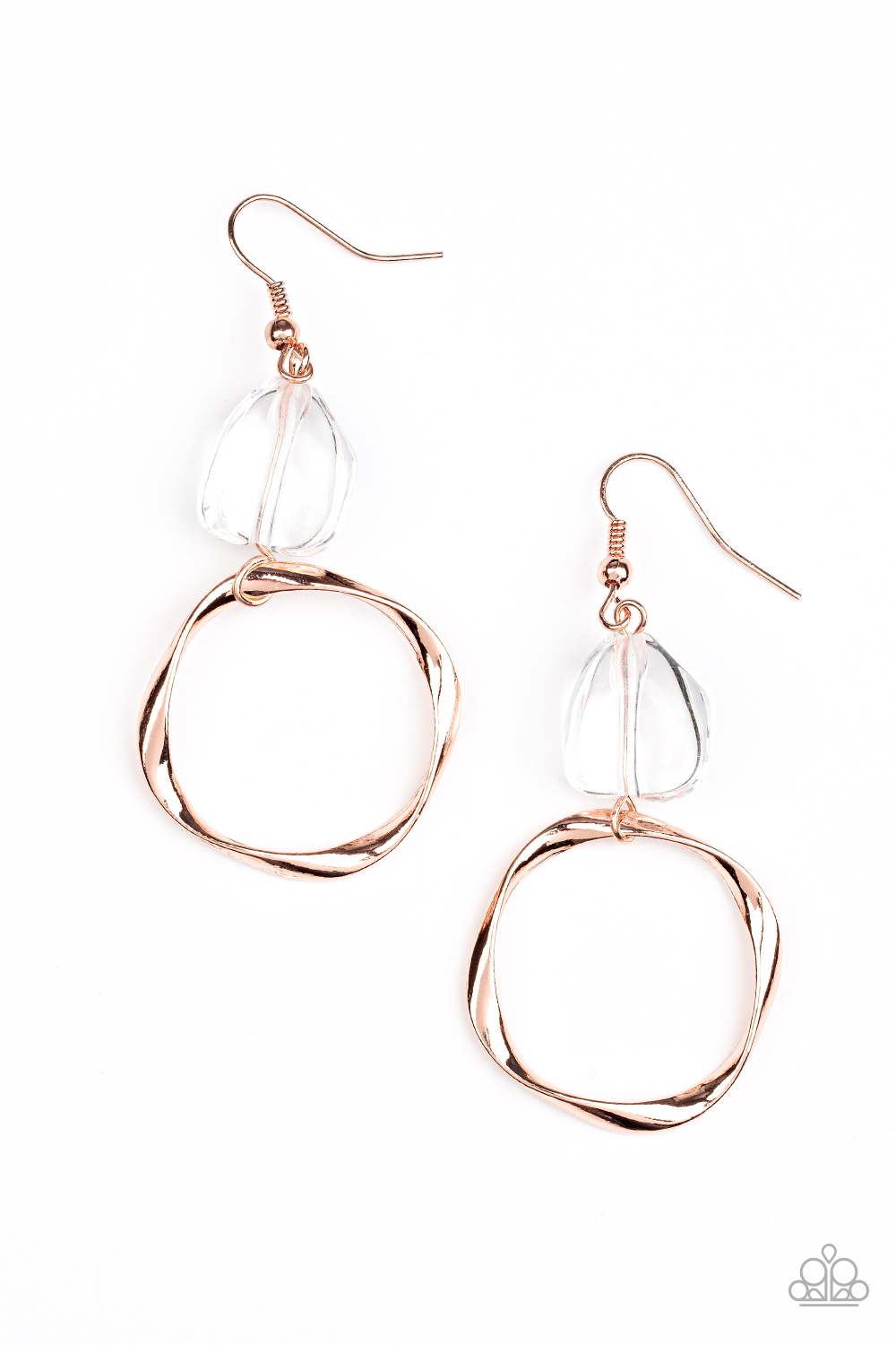 An imperfect crystal-like gem gives way to a twisted shiny copper hoop, resulting in a refined asymmetrical display. Earring attaches to a standard fishhook fitting.