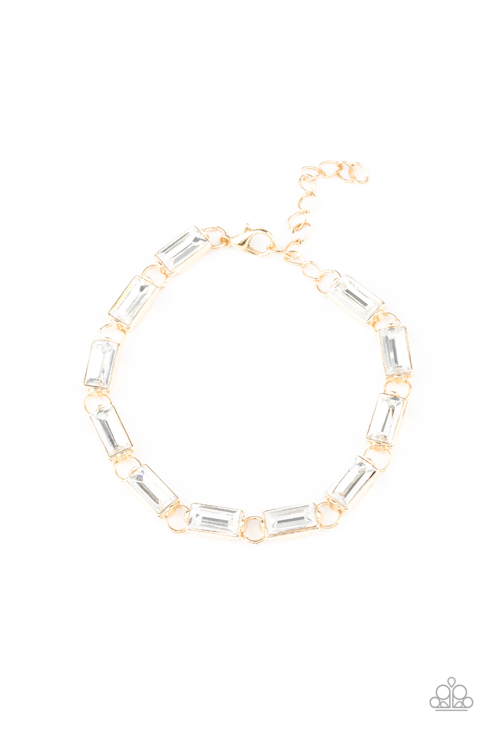 Featuring sleek gold frames, a glittery collection of emerald cut white rhinestones delicately link across the wrist for a glamorous look. Features an adjustable clasp closure.