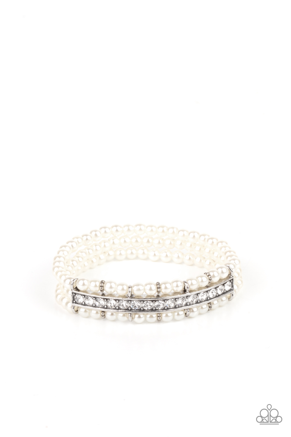 Threaded along stretchy bands, three rows of dainty white pearls are held in place around the wrist by a white rhinestone encrusted centerpiece for a romantic flair.