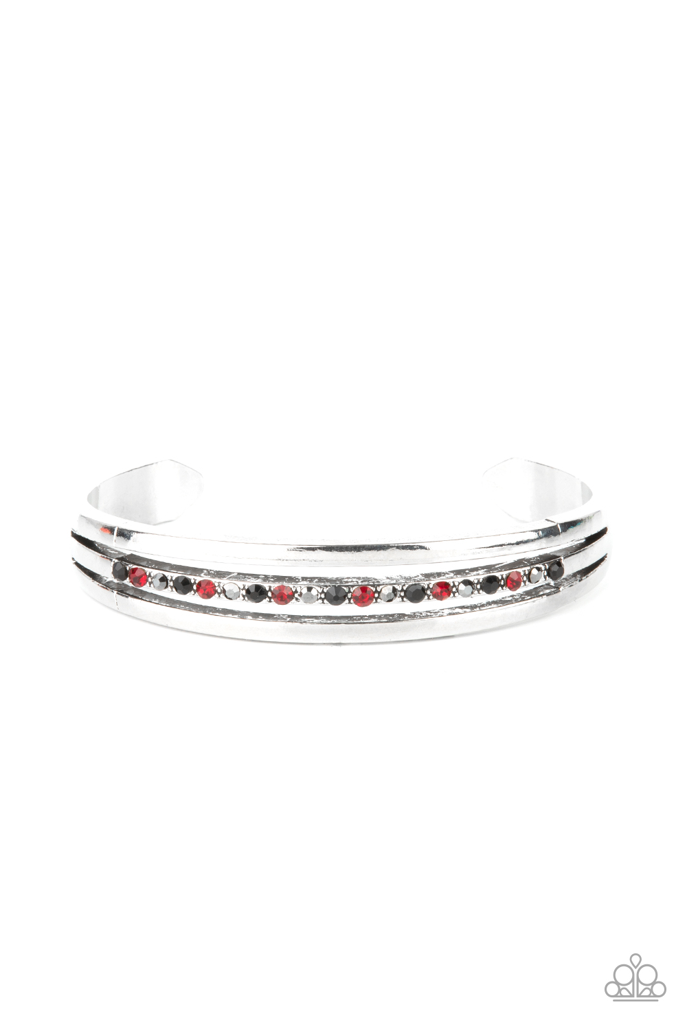 Two glistening silver bars flank a row of black, red, and hematite rhinestones, coalescing into a dainty layered cuff around the wrist for a dash of refined edge.