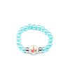 Crowned with a floral bouquet, a unicorn with fluttering eyelashes adorns a white metallic disc. The stretchy beaded bracelets vary in springtime colors of blue, hot pink, light pink, and green.