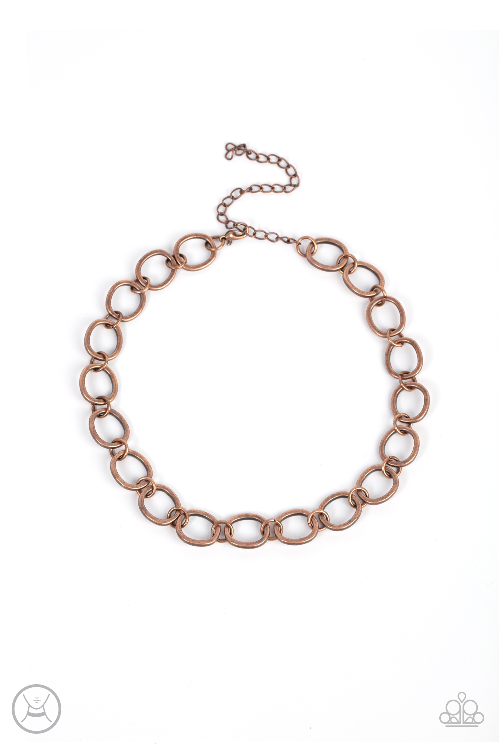 Brushed in an antiqued finish, imperfectly shaped copper circles link together for a gritty industrial statement. Features an adjustable clasp closure.