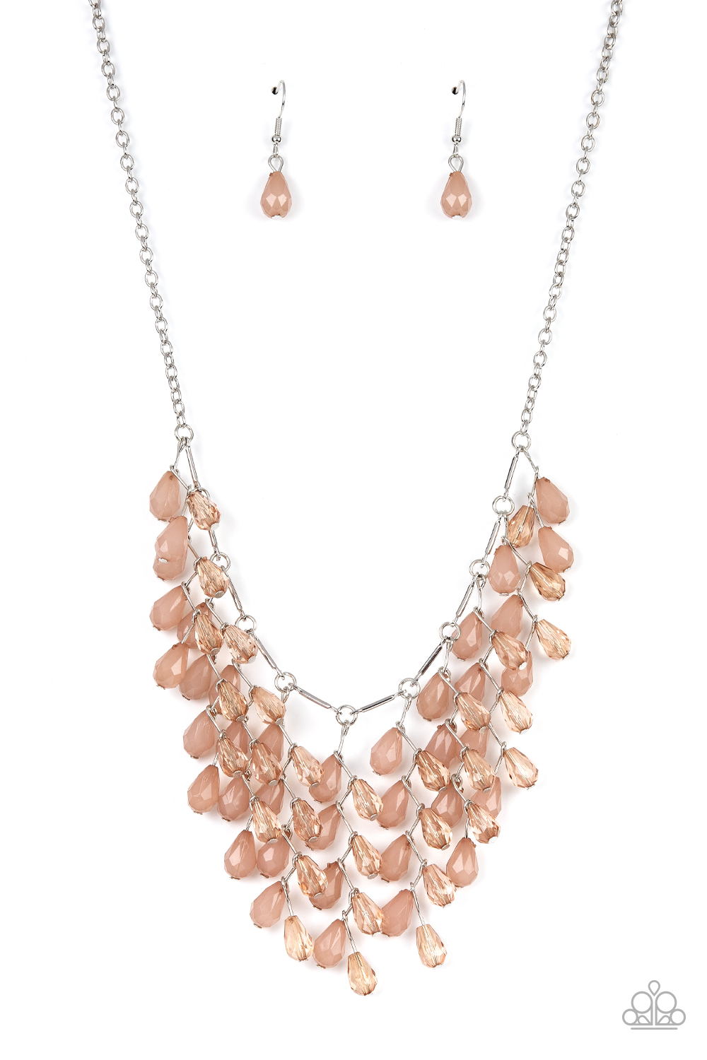 A shimmery collection of opaque and clear crystal-like brown teardrop beads delicately cluster along a linked strand of silver bars, creating an ethereally leafy fringe below the collar. Features an adjustable clasp closure.
