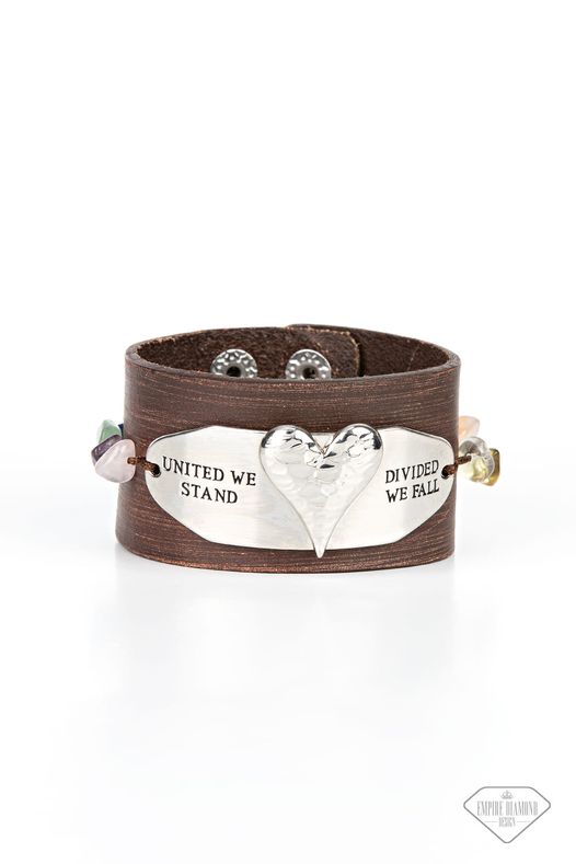 A strand of raw cut multicolored pebbles is threaded through the edges of a curved metal plate, studding the asymmetrical frame in place across the front of a distressed brown leather band. The silver frame is adorned with a hammered silver heart and stamped in the inspiring phrase, "United we stand/Divided we fall." Features an adjustable snap closure. Sold as one individual bracelet. This Empire Diamond Exclusive was designed by 2020 Life of the Party member with Empire Diamond Access, Monica C.