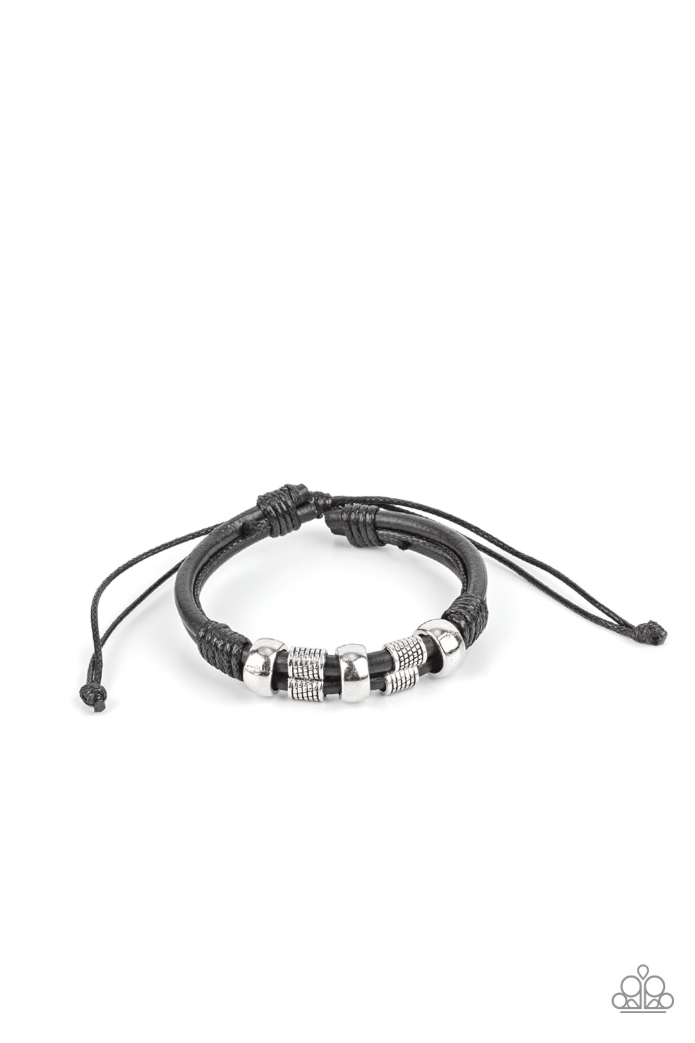 Shiny and textured silver cylindrical accents slide along a double layer of thick black leather cording. Glossy thread wrangles the ends together creating a rustic finish as it wraps around the wrist. Features an adjustable sliding knot closure.