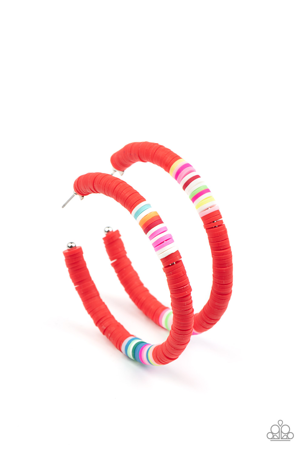 Rubbery red, blue, green, pink, orange, yellow, and white bands are threaded along an oversized silver hoop, creating a courageous pop of color. Earring attaches to a standard post fitting. Hoop measures approximately 2 1/4" in diameter.