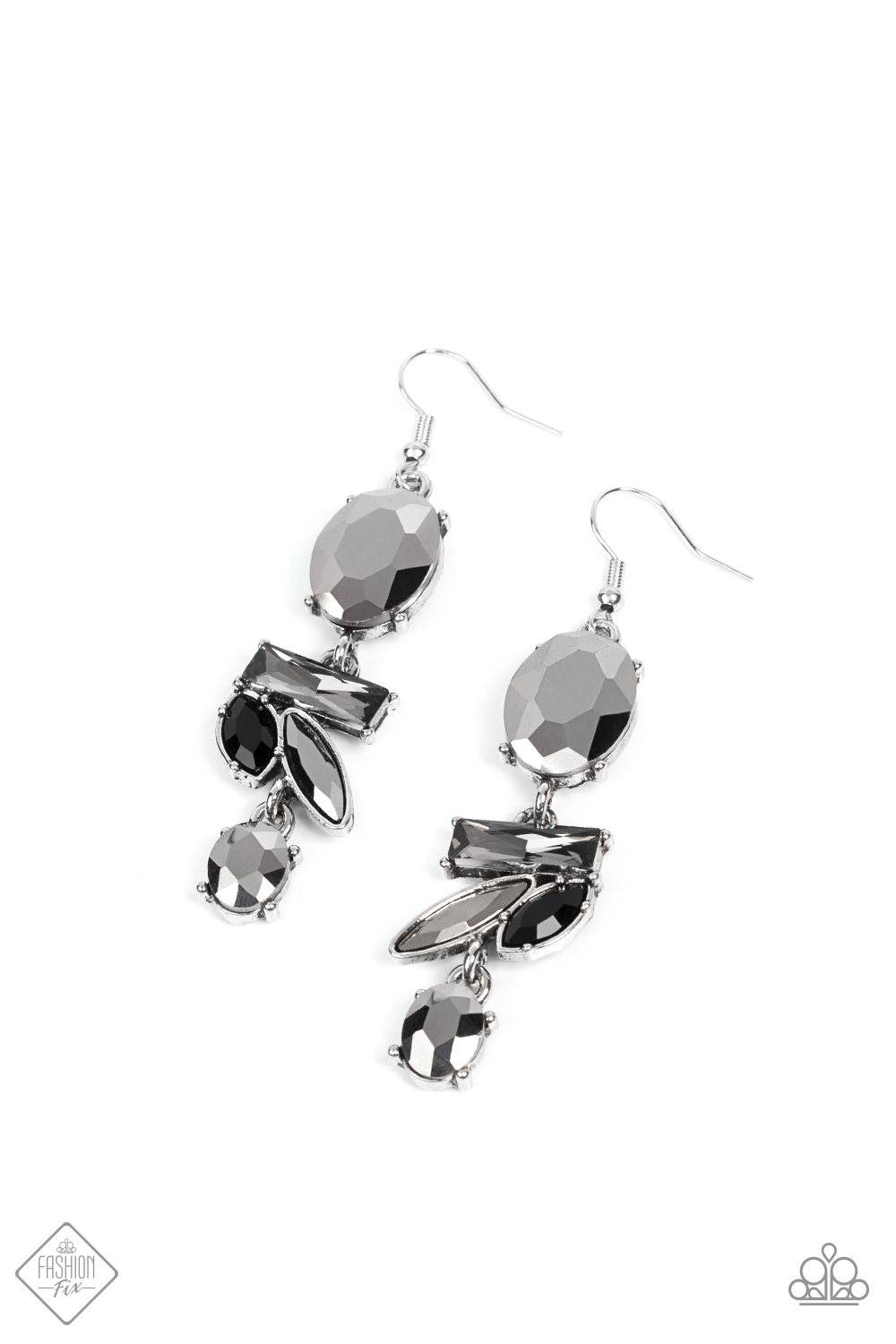 A stunning faceted hematite gem, set in pronged silver fittings, gives way to an edgy collection of lustrous hematite, smoky, and black rhinestones creating a modern statement-making lure. Earring attaches to a standard fishhook fitting.