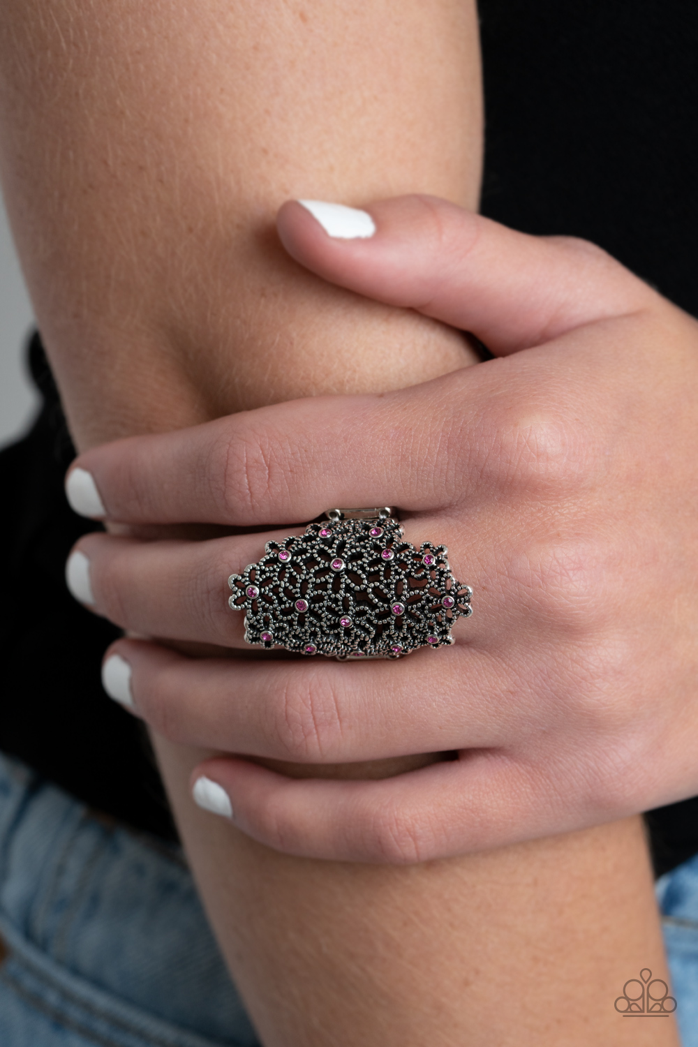 Dotted with dainty pink rhinestone centers, a bouquet of silver flowers blooms across the finger for a seasonally whimsical look. Features a stretchy band for a flexible fit.