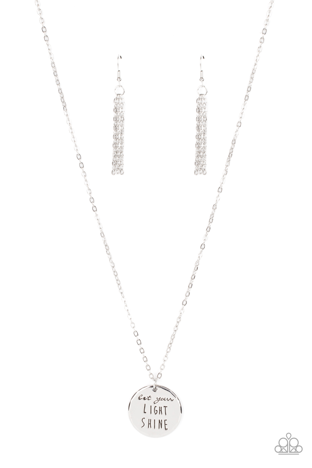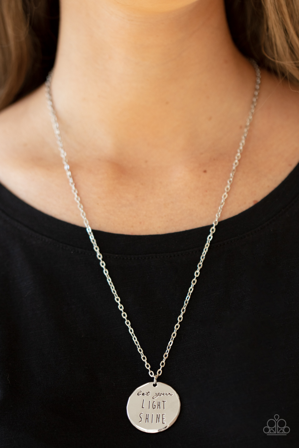 A shiny silver disc is stamped in the inspiring phrase, "Let your light shine," at the bottom of a shiny silver chain. Features an adjustable clasp closure.