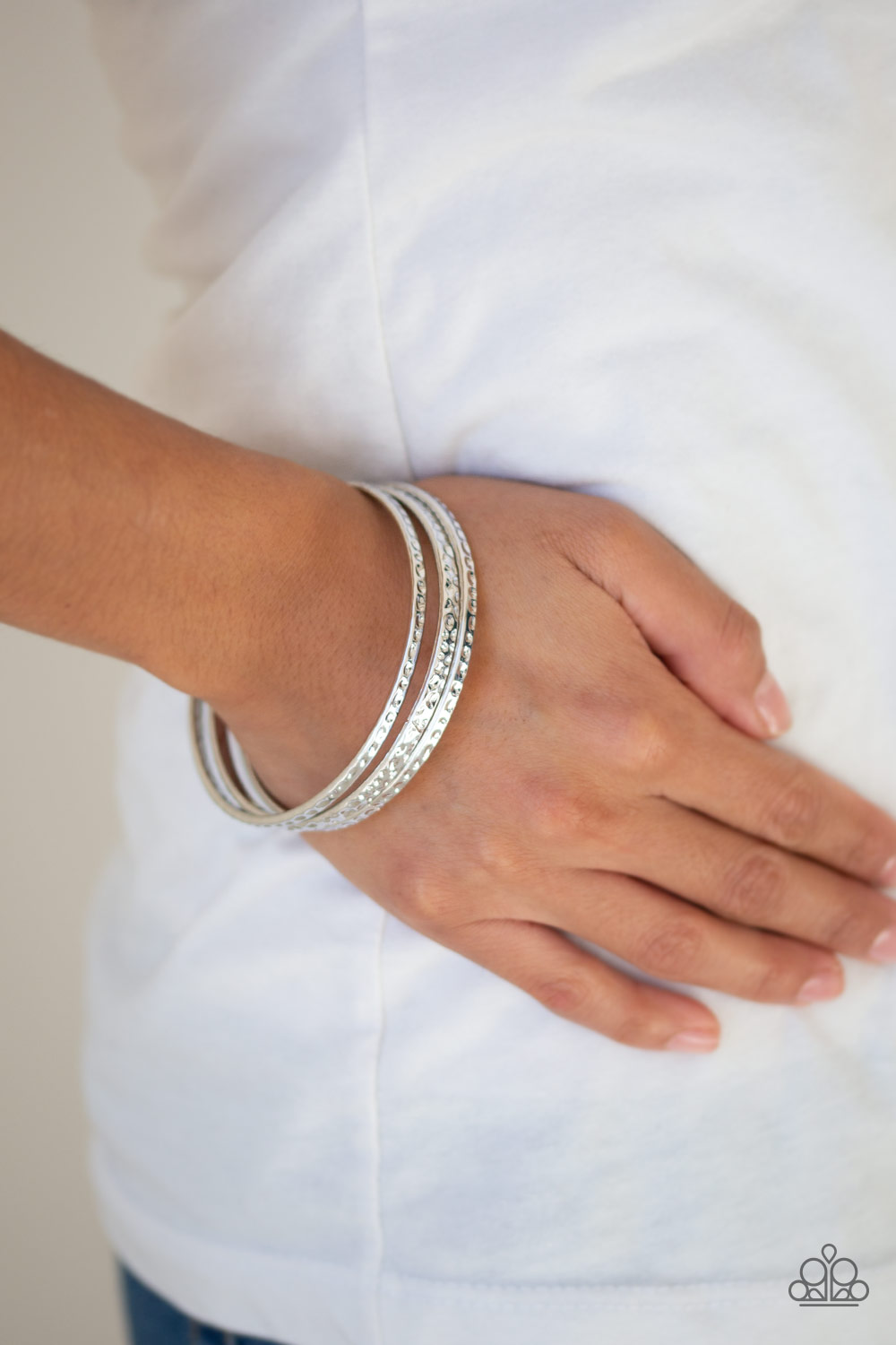 Delicately hammered in shimmery textures, a trio of glistening silver bangles glide across the wrist for a sleek look.