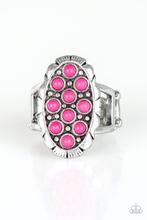 Dainty pink stones are sprinkled across the front of a studded silver frame, creating a vivacious centerpiece atop the finger. Features a stretchy band for a flexible fit. Sold as one individual ring.