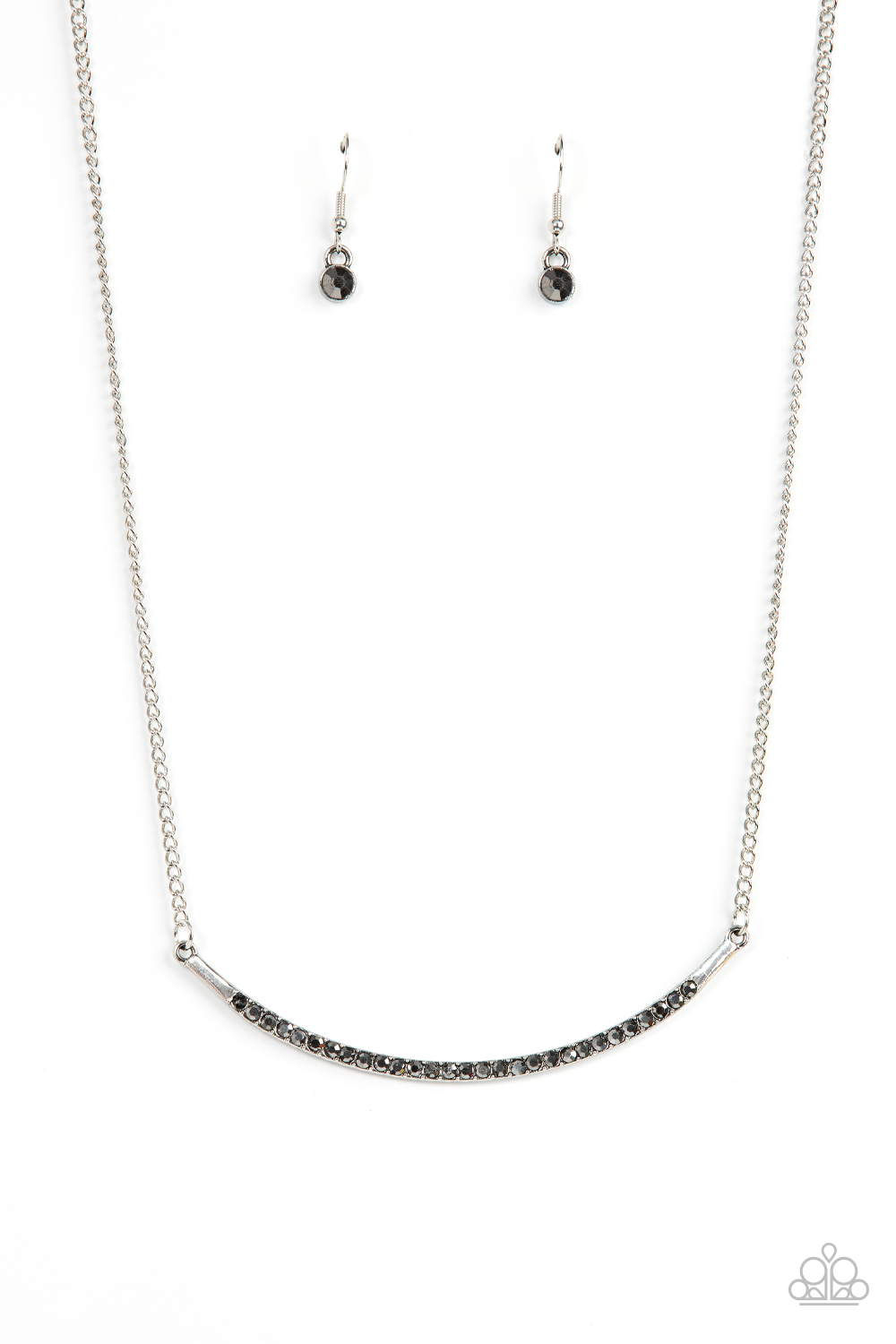 Encrusted in smoky hematite rhinestones, a curved silver bar bows below the collar for a smoldering style. Features an adjustable clasp closure.