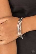 Three shiny silver and two topaz rhinestone encrusted bangles stack across the wrist for a refined look. Sold as one set of five bracelets.