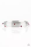Three shiny silver and two red rhinestone encrusted bangles stack across the wrist for a refined look.Sold as one set of five bracelets.