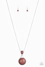 Encased in silver, a brown teardrop stone hinges to a large round brown stone at the bottom of a lengthened silver popcorn chain, creating a one-of-a-kind pendant. Features an adjustable clasp closure.