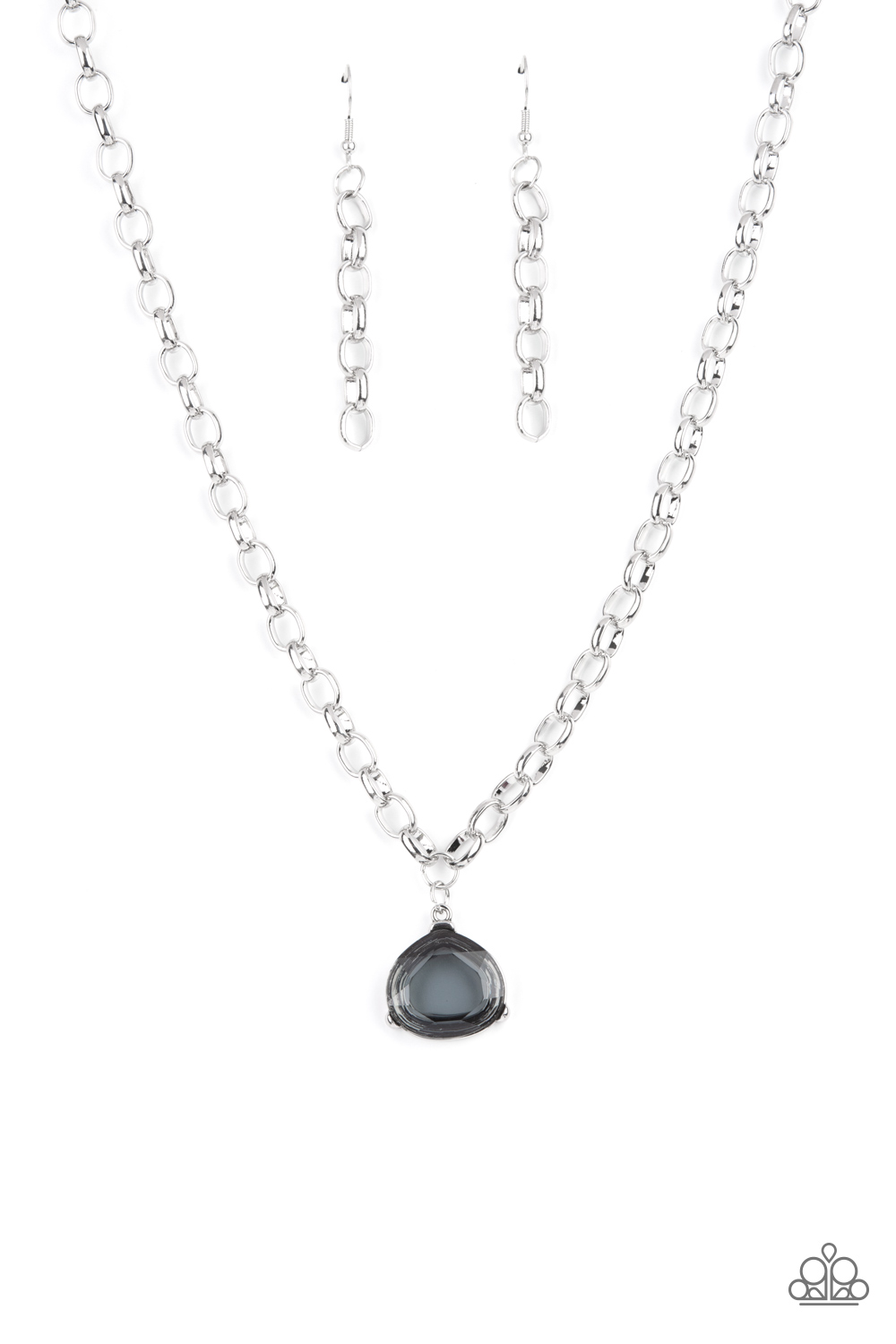 An oversized smoky gem is pressed into a pronged silver fitting at the bottom of a chunky silver chain, creating a dramatic pendant below the collar. Features an adjustable clasp closure.