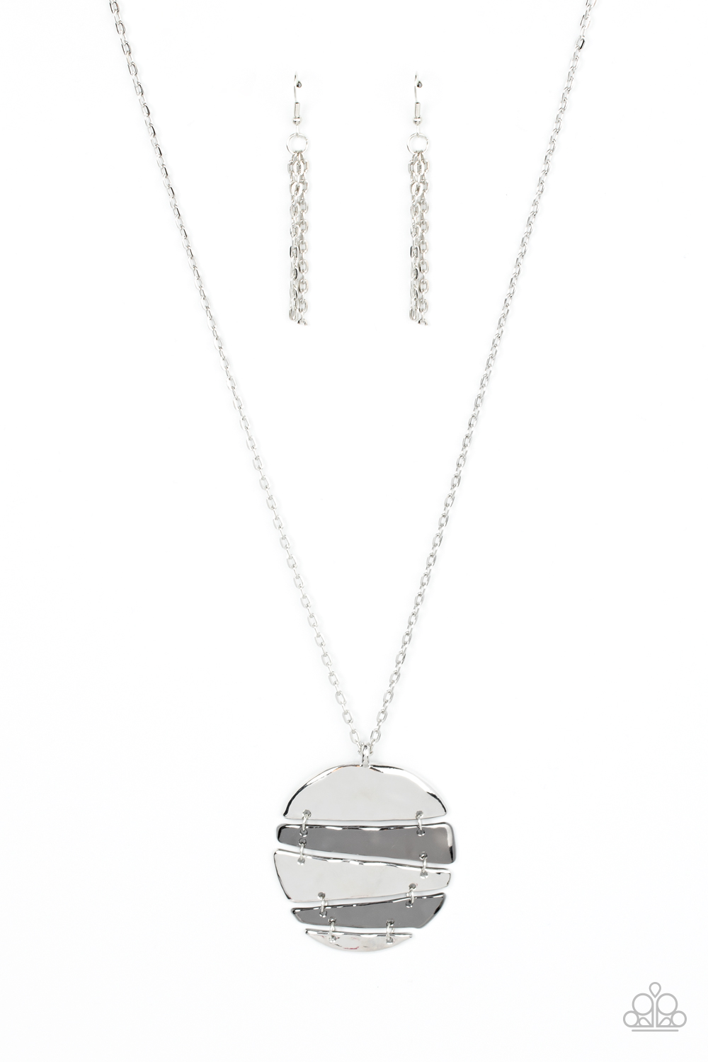 Slices of hammered silver and gunmetal frames linked into an abstract mixed metallic palette at the bottom of a lengthened silver chain, creating an edgy centerpiece. Features an adjustable clasp closure.