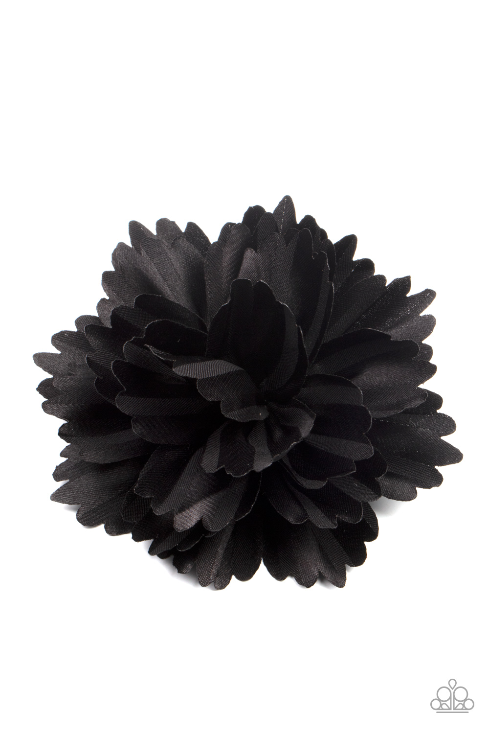 Layers of scalloped black petals gather into an elegant satin blossom, creating a timeless display. Features a standard hair clip on the back.