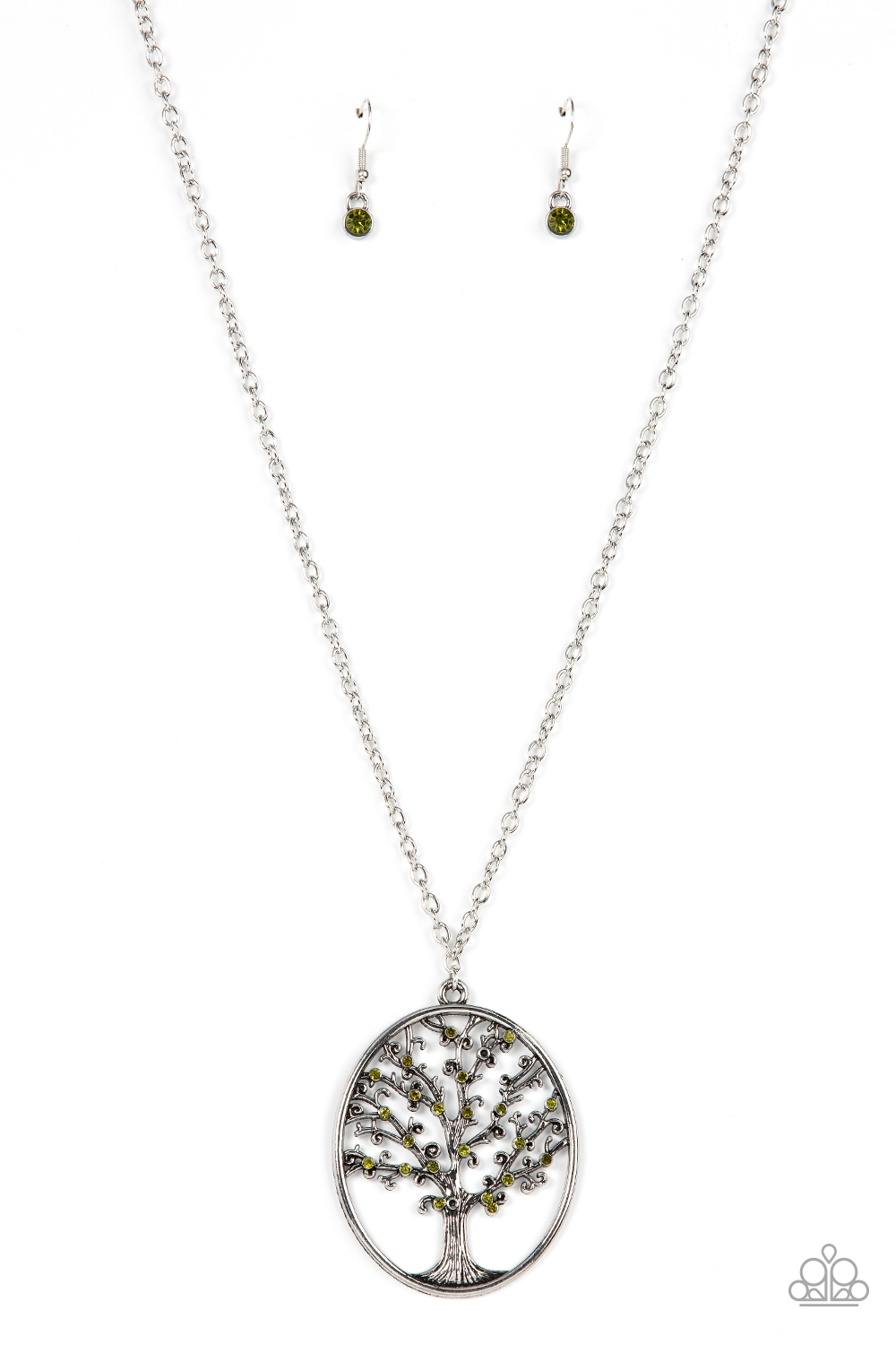 Dainty green rhinestones are sprinkled across the top of a silver tree beautifully branching inside an oval silver frame, resulting in a seasonal pendant at the bottom of an extended silver chain. Features an adjustable clasp closure.