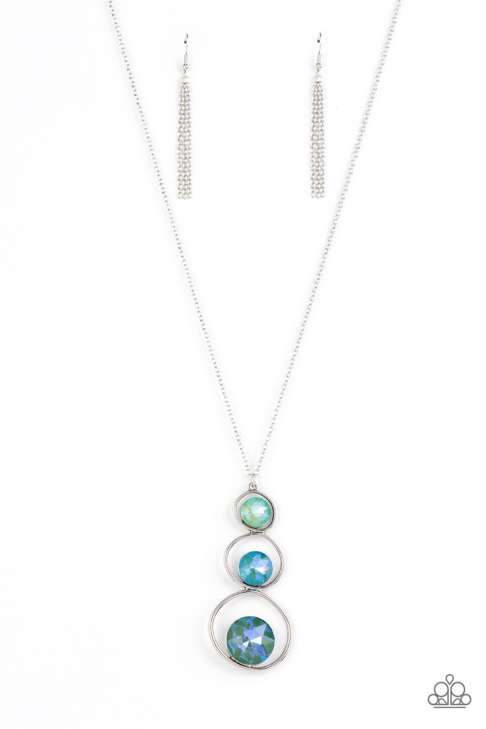 A sparkly ombré of opalescent green gems adorn the bottoms of three silver hoops that gradually increase in size as they stack into an asymmetrical pendant. The glowing pendant swings from the bottom of a lengthened silver chain, creating a stellar centerpiece. Features an adjustable clasp closure.