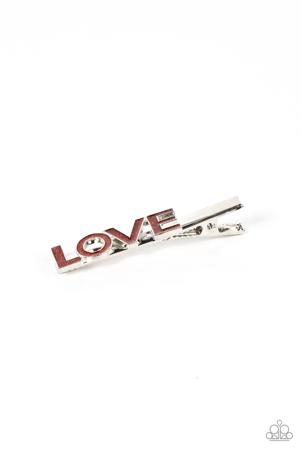 Featuring a glittery red finish, the word, "Love," is spelled across the front of a pair of silver hair clips for a colorfully charming look. Features standard hair clips on the back.