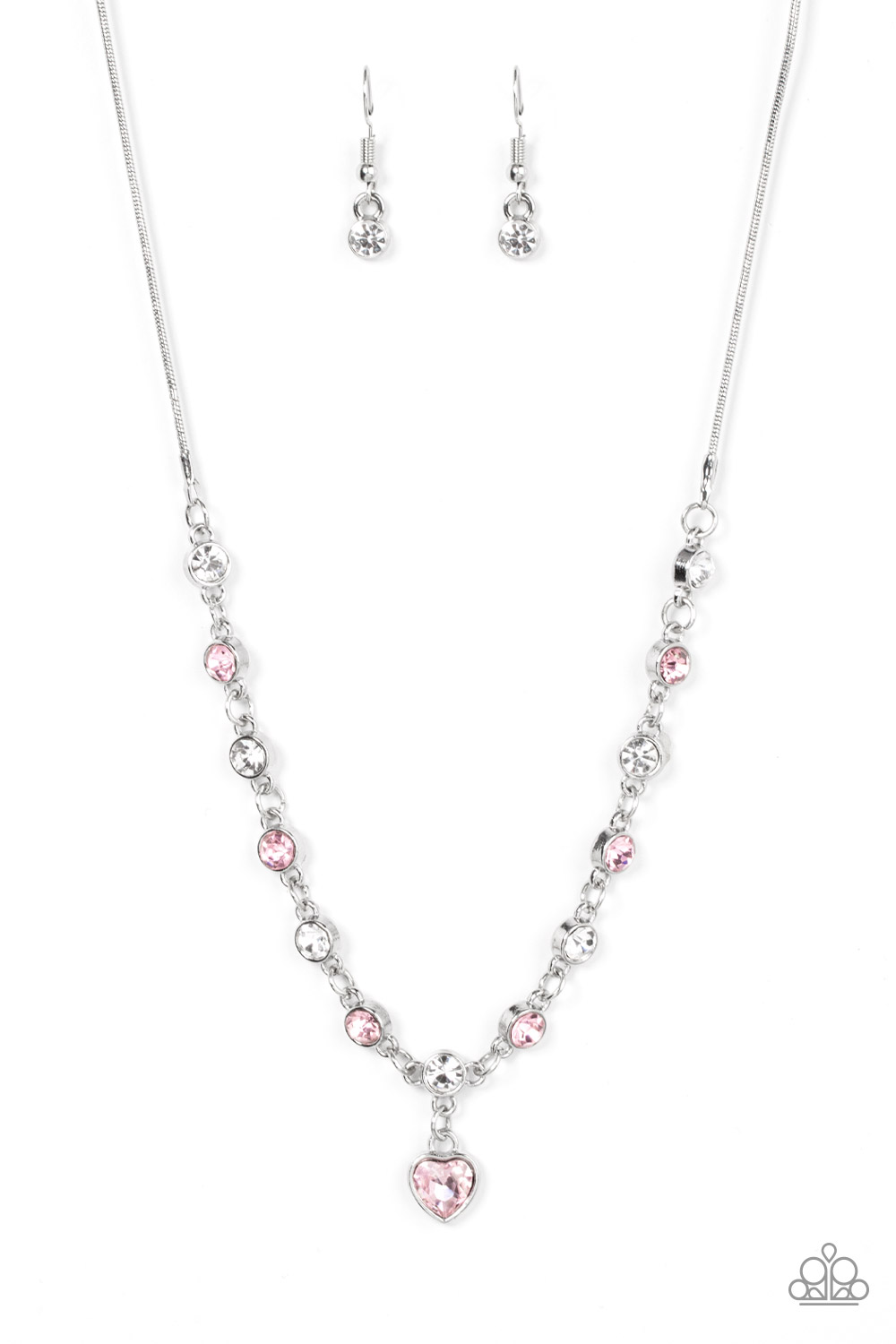 A pink rhinestone heart charm dances from a strand of white and pink rhinestones, resulting in a flirtatious sparkle below the collar. Features an adjustable clasp closure.
