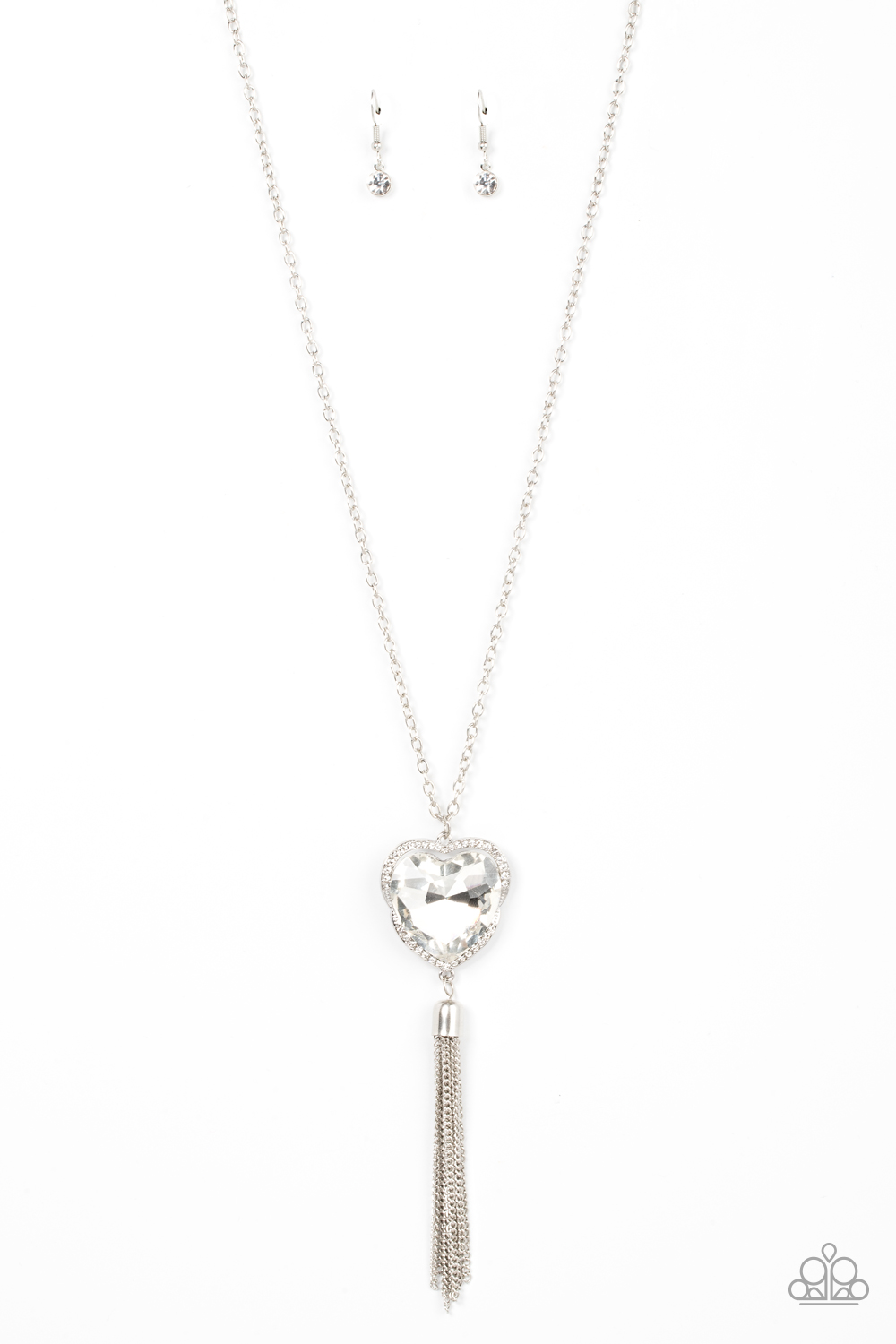 Bordered in a ribbon of glassy white rhinestones, an oversized white heart-shaped gem seemingly floats at the bottom of an extended silver chain. A shimmery silver chain tassel dances from the bottom of the sparkly pendant for a flirtatious finish. Features an adjustable clasp closure.