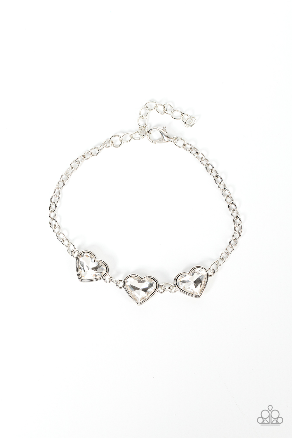 Nestled in silver frames, a trio of glittery white heart-shaped gems delicately links across the wrist for a dash of swoon-worthy shimmer. Features an adjustable clasp closure.