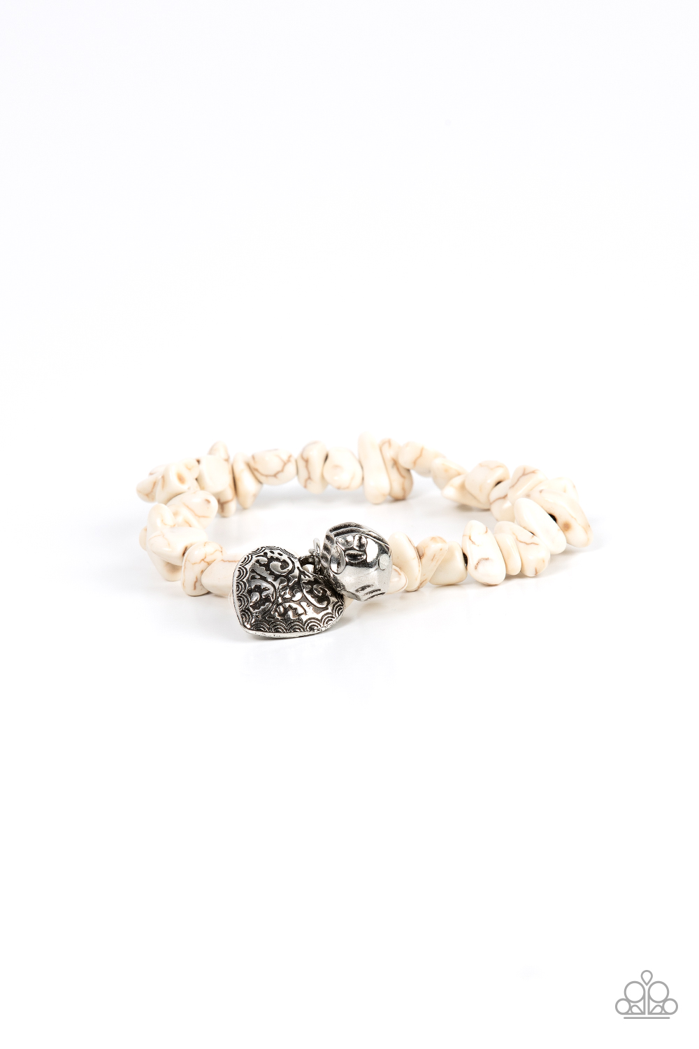 Infused with a hammered silver bead and decorative silver heart charm, an earthy collection of white pebbles are threaded along a stretchy band around the wrist for a whimsical fashion.