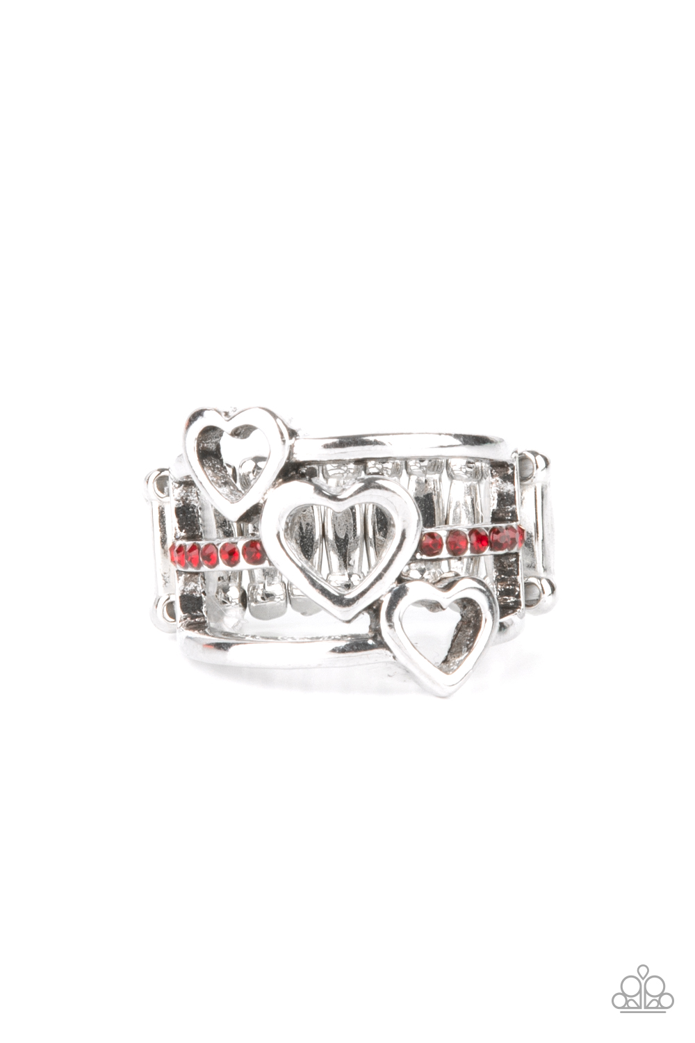 Infused with a row of fiery red rhinestones, a trio of airy silver hearts slant across three silver bands that layer into a charming centerpiece atop the finger. Features a stretchy band for a flexible fit.