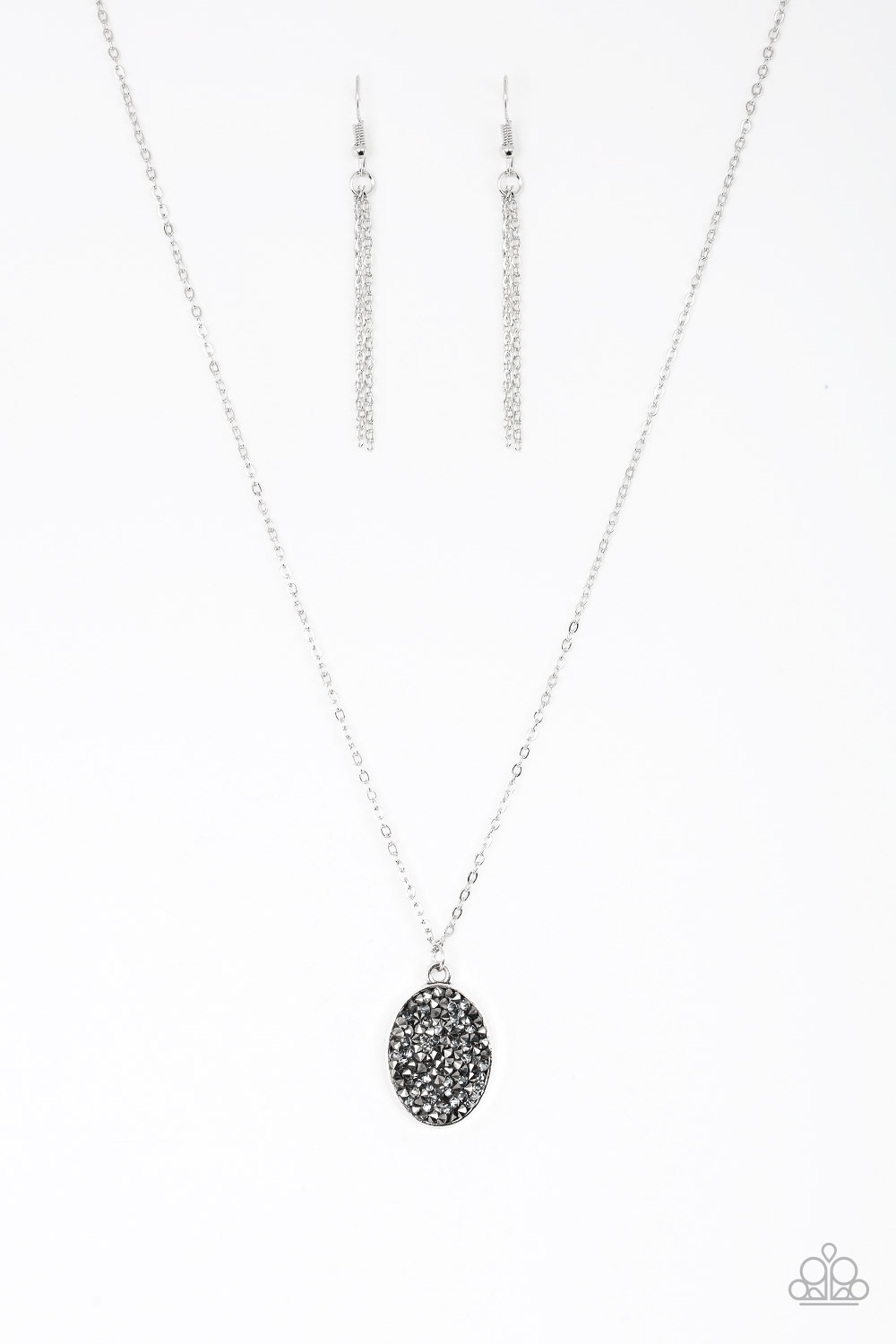 Glittery hematite and smoky rhinestones are sprinkled along an oval silver frame, creating a stellar pendant below the collar. Features an adjustable clasp closure.