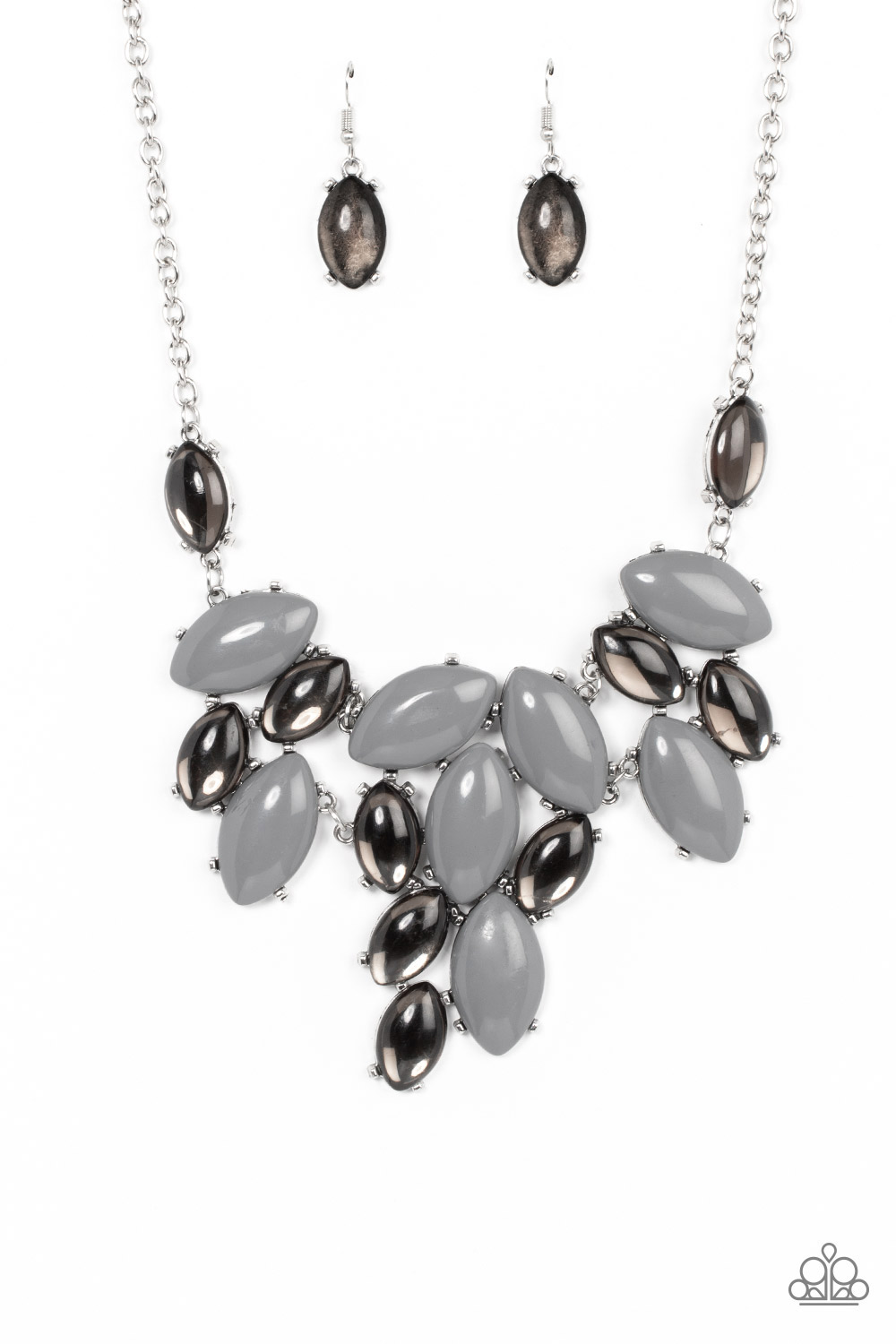 Oval shaped smoky and Ultimate Gray beads, set in exaggerated silver pronged settings and suspended from silver chains, coalesce into an asymmetrical arrangement that makes a bold impact below the collar. Features an adjustable clasp closure.