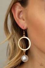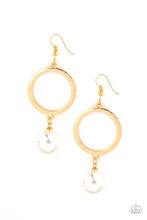 An oversized white pearl swings from the bottom of a shimmery gold hoop, creating a refined lure. Earring attaches to a standard fishhook fitting.Sold as one pair of earrings.
