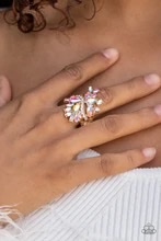 An explosion of iridescent marquise cut rhinestones flare out from a wavy band of dainty white rhinestones, creating a glamorously golden centerpiece atop the finger. Features an adjustable clasp closure.Sold as one individual ring.