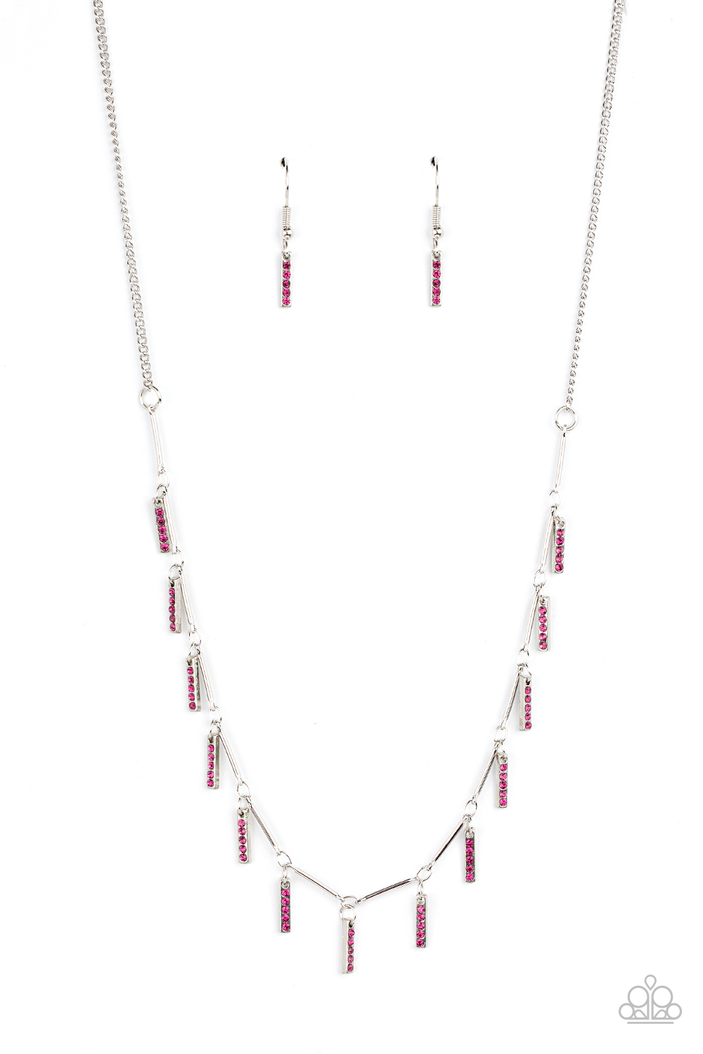 Dotted in stacks of glittery Fuchsia Fedora rhinestones, dainty silver rectangular frames drip between shiny silver bars along the collar, creating a dainty fringe. Features an adjustable clasp closure.