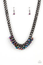 Flecked in oil spill iridescence, a faceted collection of metallic beads cluster along the center of a chunky gunmetal curb chain, creating a stellar fringe below the collar. Features an adjustable clasp closure. Sold as one individual necklace. Includes one pair of matching earrings.