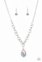 Flecked in oil spill iridescent, a smoky teardrop swings from the bottom of a chunky silver chain that attaches to a shimmery silver popcorn chain, creating a modern display below the collar. Features an adjustable clasp closure. Sold as one individual necklace. Includes one pair of matching earrings.