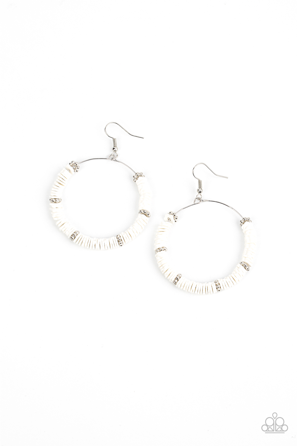 Infused with studded silver floral-shaped rings, a flirty collection of rubbery white flowers are threaded along a dainty wire hoop for a whimsical pop of color. Earring attaches to a standard fishhook fitting.