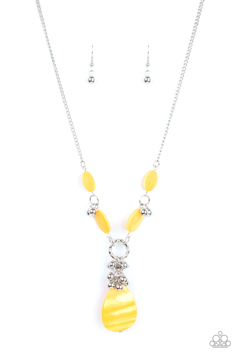 Oval Illuminating shell-like beads link with pairs of dainty silver beads below the collar. A cluster of shiny silver beads and an oversized Illuminating shell-like teardrop swings from the bottom, creating a vibrant summer inspired pendant. Features an adjustable clasp closure.