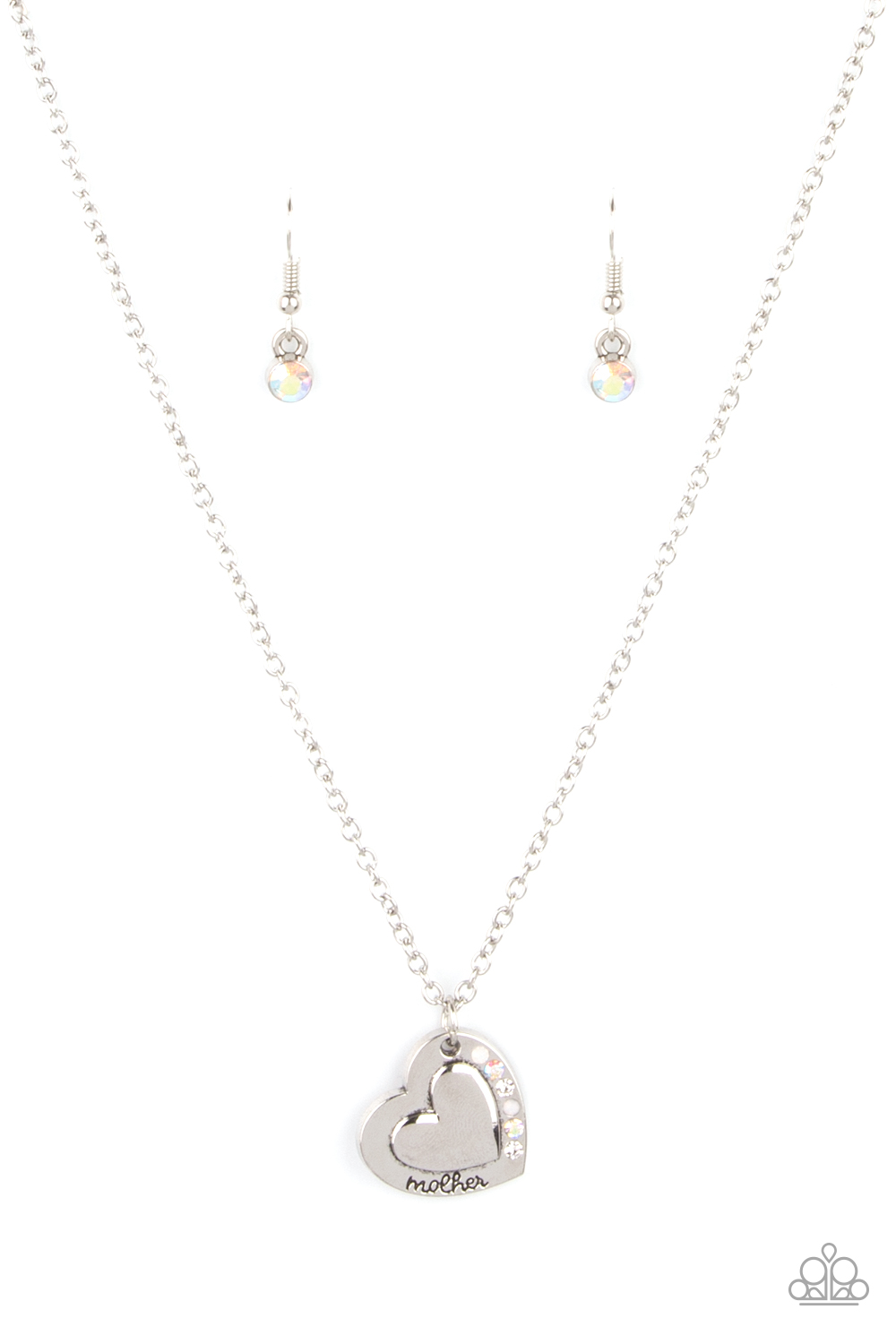 Stamped in the word, "Mother," an embossed heart pendant is encrusted in a row of white and iridescent rhinestones, creating a sparkly sentimental centerpiece below the collar. Features an adjustable clasp closure.